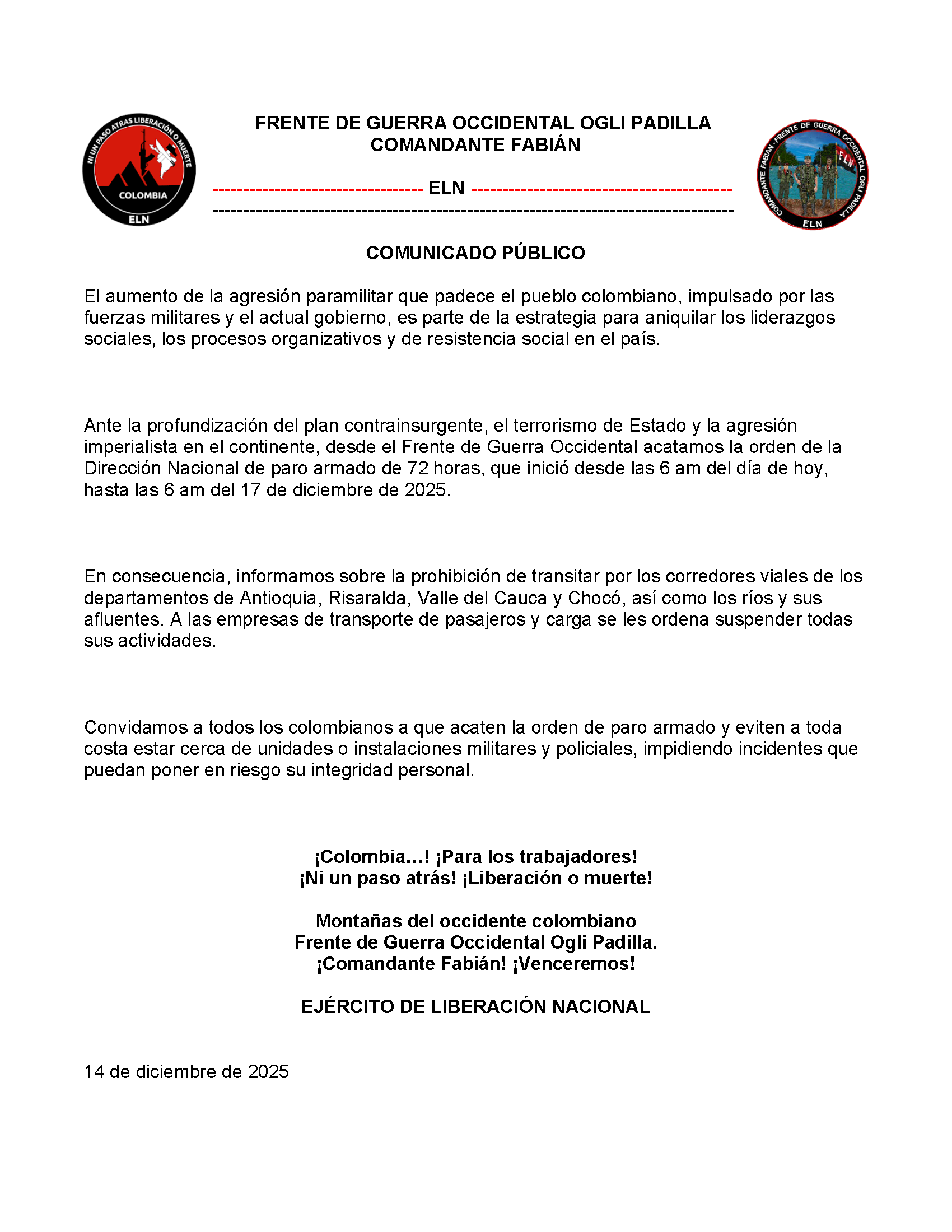 Navegación de entradas En contra de la intervención imperialista y de los dictados de la oligarquía vende Patria, decretamos: Un paro armado de 72 horas, que inicia el 14 de diciembre del 2025